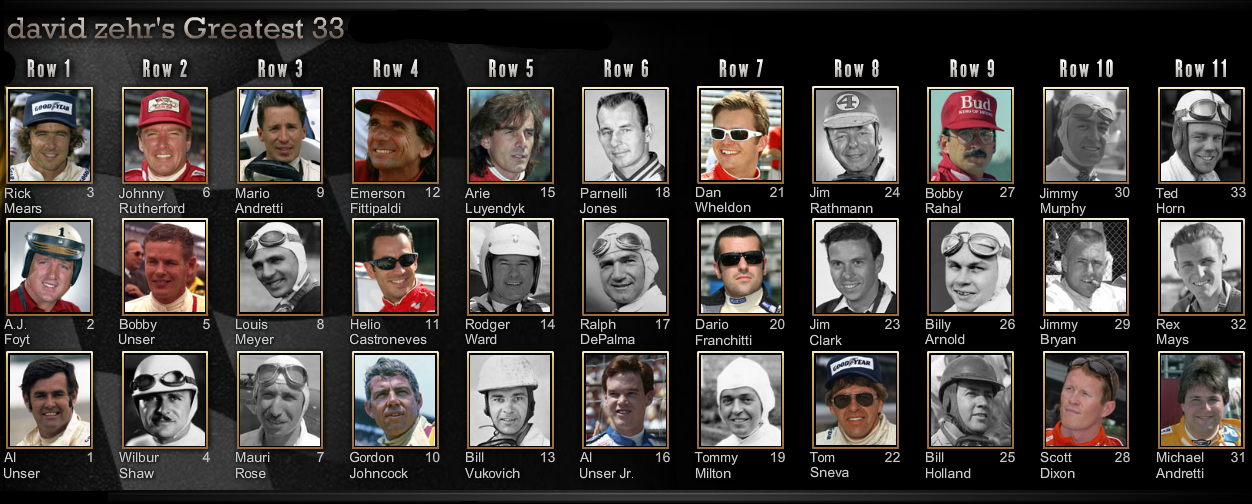 My original intent was to use select statistics to weed out so many emotional arguments and get a clear handle strictly on the elite performers at Indy. My formula (which included weighted statistics of: # of Races, Poles, Laps Lead, Wins, and Top 5s) gave me a solid 27 drivers which includes all of the 4-, 3-, and 2-time winners plus significant 1-time winners, so I elected to make space (Row 11) for only those performers who had no wins but amazing career numbers at the Brickyard. The remaining 3 places of Row 10 would be debated on the merits of a tightly-scored group of 5 drivers, all with 1 win.
