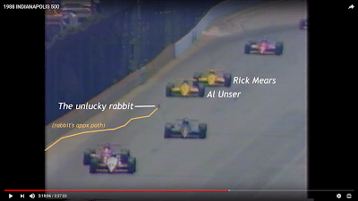 Today I offer my small slice of trivia from the 1988 race which I, and a few hundred others witnessed in person: May 29, 1988 – Al Unser and the unlucky rabbit.